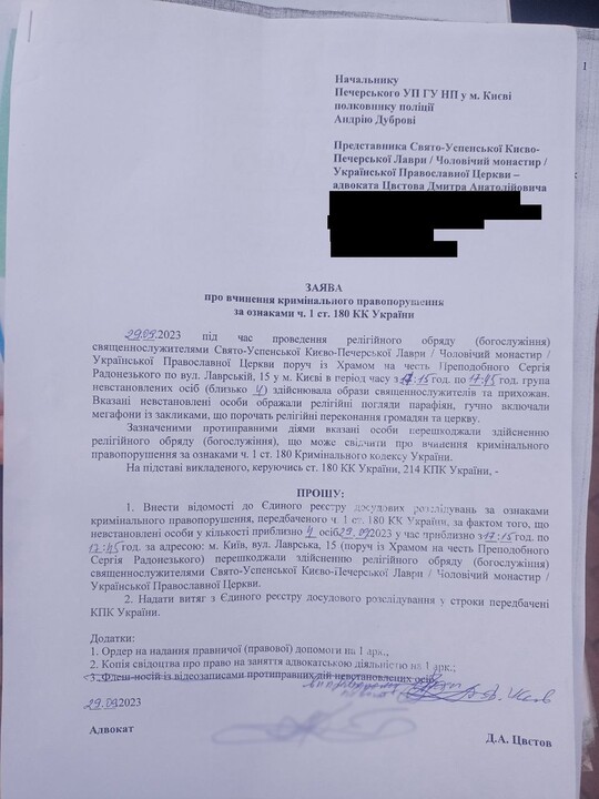 On September 29, 2023, Dmitry Tsvetov, the lawyer for the Kyiv-Pechersk Lavra, submitted his sixth complaint to the Pechersk District Police Department regarding obstruction of religious services near the monastery, reports the “KozakTv1” Telegram channel.