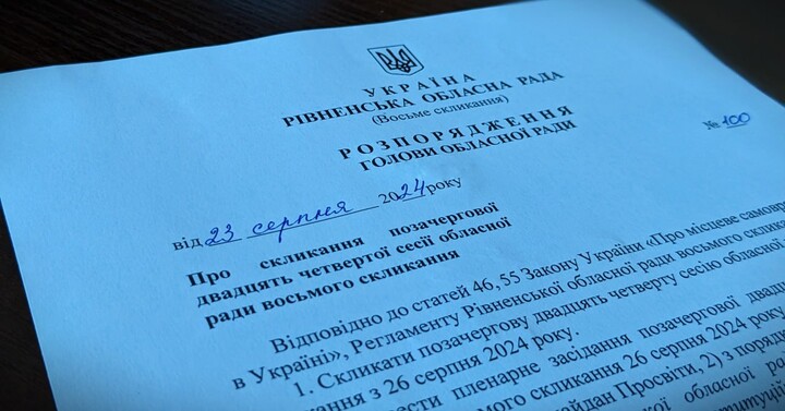 Chairman of the Rivne Regional Council Andriy Karaush convenes an extraordinary session at 10:00 on Monday, 26 August. “Only one question will be considered – ‘On the appeal of the Rivne Regional Council on the implementation of the norms of the legislation on the protection of the constitutional order in the sphere of religious organizations and strengthening the spiritual independence of Ukraine’,” wrote Karaush on his Telegram channel.