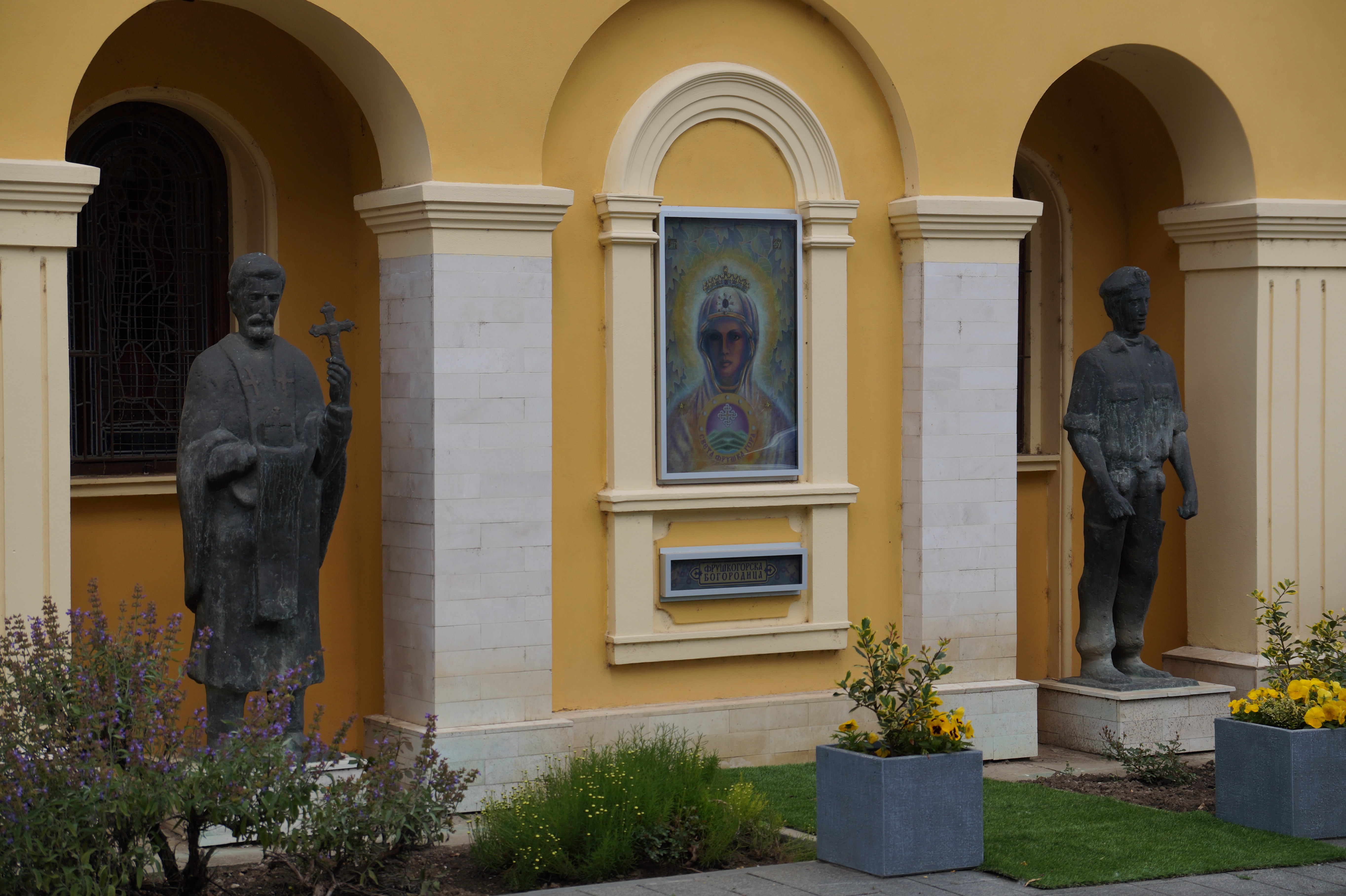 Спољне нише красе бронзане скулптуре – српског војника и српског свештеника – дело чувеног вајара Јована Солдатовића. Он је познат по споменику Жртвама рације „Породица“ на новосадском кеју и статуи Ђуре Јакшића у Дунавском парку.