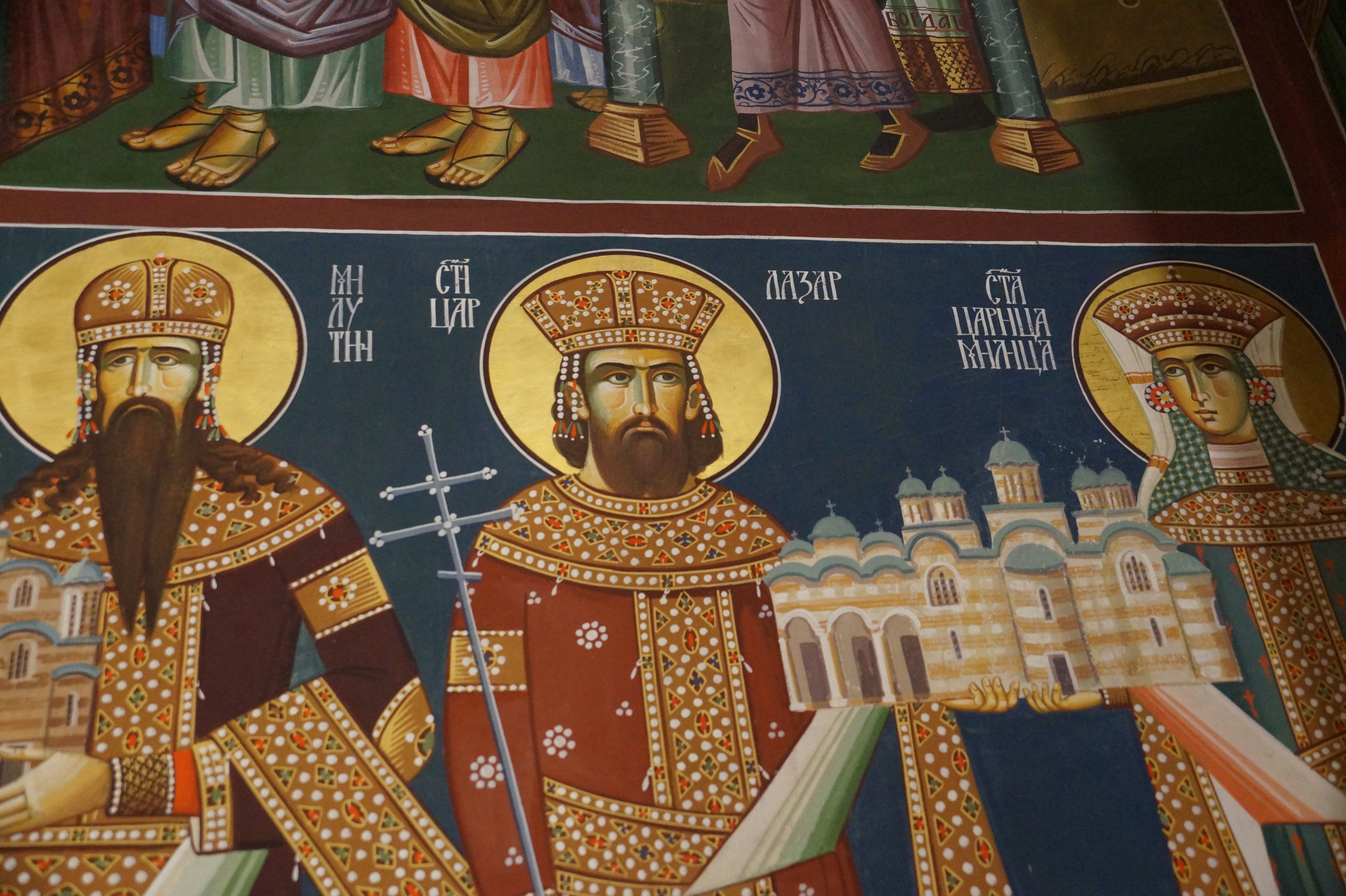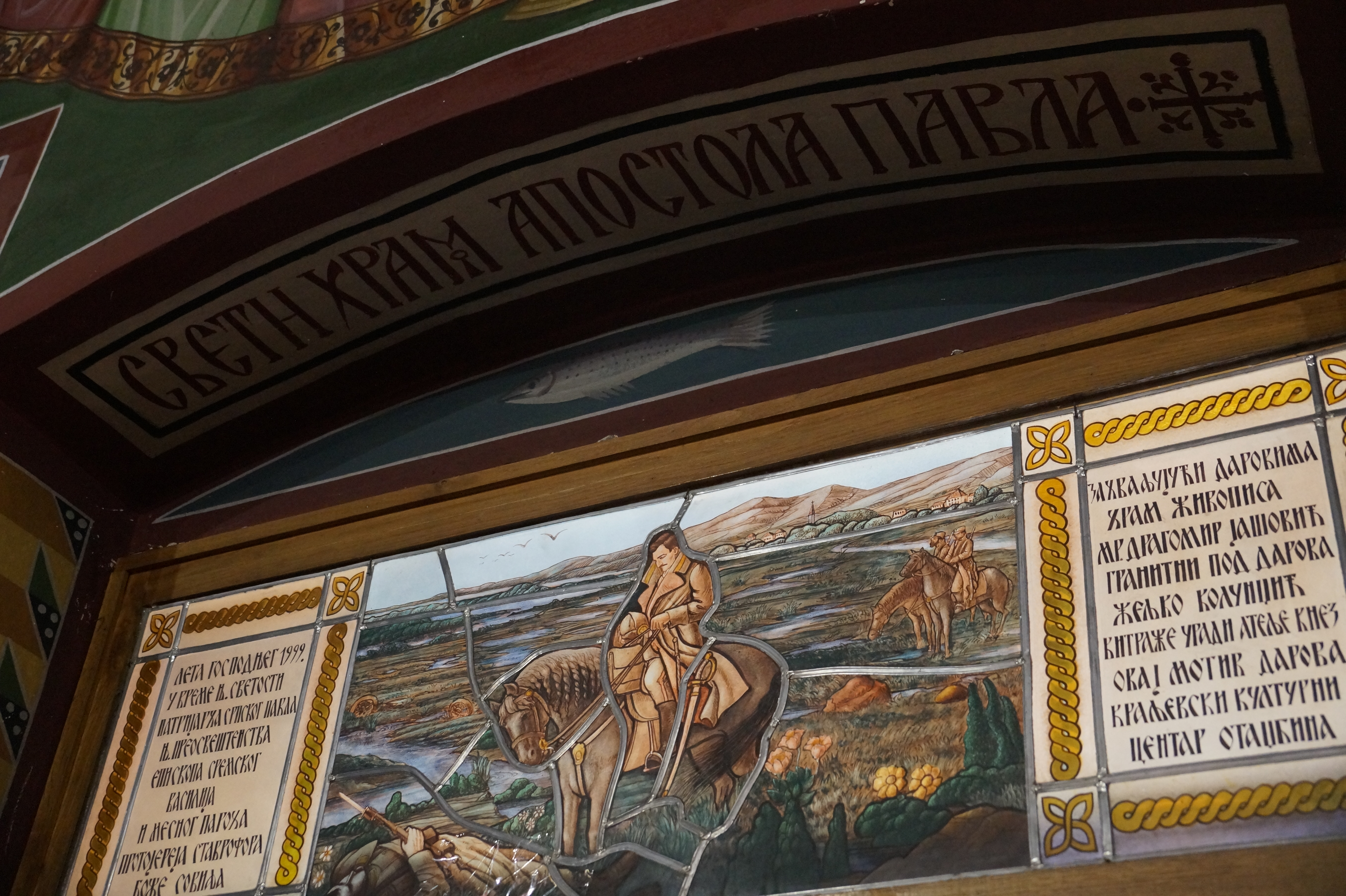 Прота Благоје Катић својевремено нам је испричао о историји и значају овог храма и објаснио приказане личности из историје и епова Срба из времена Косовског боја наовамо. Тад нам је рекао: „Могу нам окупирати део територије, али ако нам сећање на то неко избрише и одузме – ми смо нестали као народ. Тако да не дамо да нам то узму и то избришу. Ако треба, док не дође нека друга генерација која ће то можда повратити у састав државе, ми ћемо чувати успомену на то.“