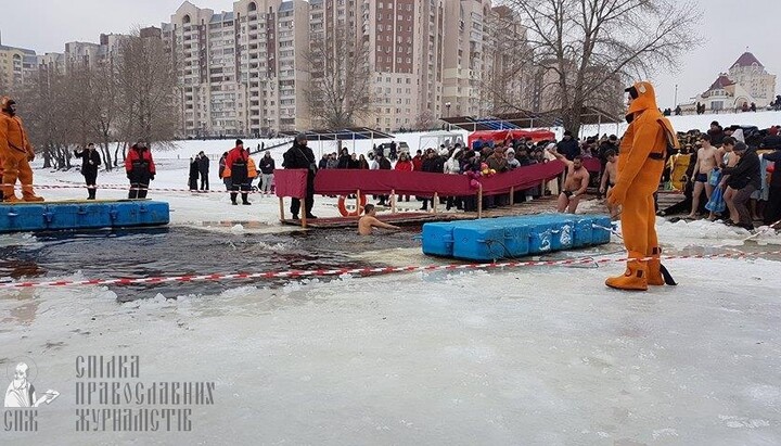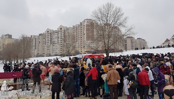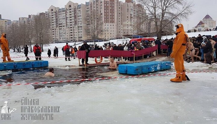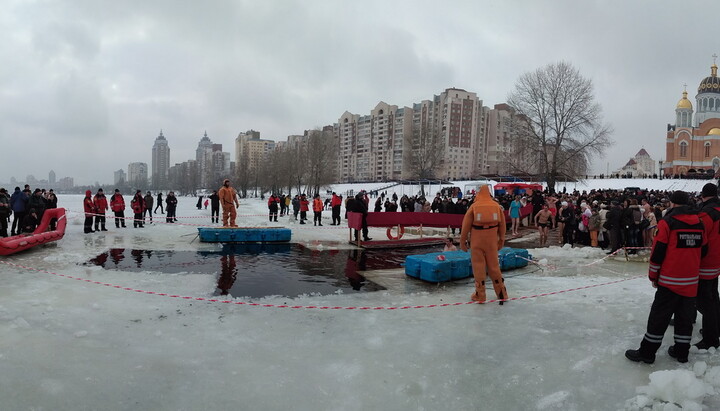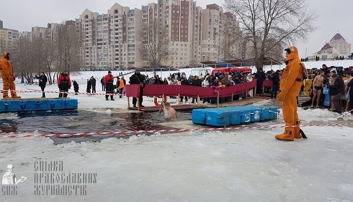 The Primate, served by the hierarchs of the Ukrainian Orthodox Church, conducted a rite of blessing the water and sank the cross into the river. Then the Metropolitan blessed all the attendees and aspersed everybody.