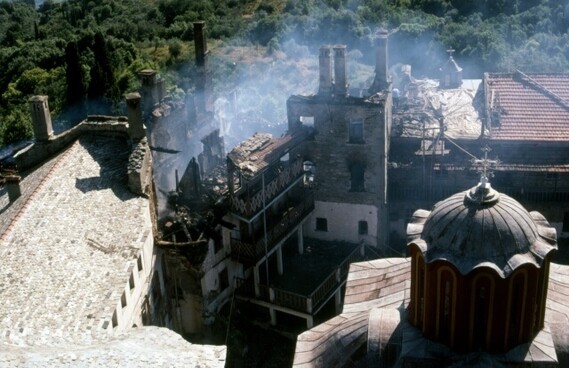One of the unique moments captured by the photographer and professor of emeritus of history at the University of Wisconsin was the smoke rising from Karakallou Monastery after it was struck by lightning on the evening of June 14, 1988. The photo shows the wooden construction of the walls of the monastery, seemingly impenetrable from the outside, vulnerable to fire. The photographer also captured icons and crosses made on the Holy Mountain and various sacred objects cherished in the monasteries.