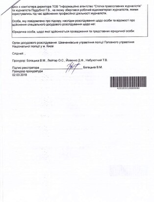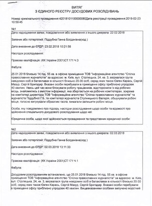On February 23, 2018, the UOJ statement was registered in the Unified Register of Pre-trial Investigations under part 3, and on March 2, 2018 – under part 3 of Article 171 of the Criminal Code of Ukraine (Obstruction of the lawful professional activity of journalists).