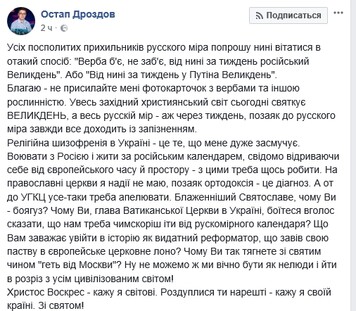 "Religious schizophrenia in Ukraine is something that upsets me greatly. I have no hope for Orthodox churches, because Orthodoxy is a diagnosis. But the UGCC still needs to be appealed. Blessed Sviatoslav, why are you a coward? Why are you, the head of the Vatican Church in Ukraine, afraid to say out loud that we need to move away as soon as possible from the Russian-world calendar?" writes the journalist.