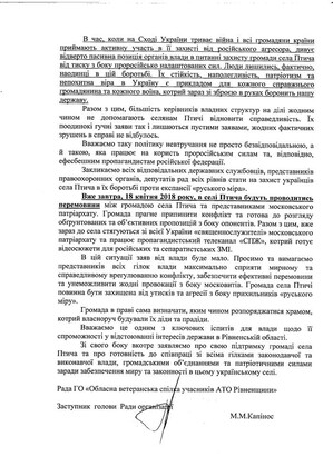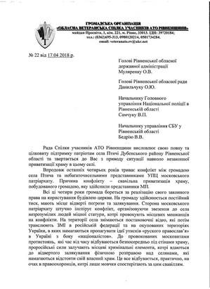 "We call on all authoritative civil servants, representatives of law enforcement agencies, councilors of all levels to defend the Ukrainian village of Ptichya in its struggle against the expansion of the Russian world," reads the letter of the "Regional Veterans’ Union of ATO participants of Rovno region. “Tomorrow, on April 18, 2018, in the village of Ptichya, negotiations will be held between the villagers and representatives of the Moscow Patriarchate. The society seeks to end the conflict and is ready to consider reasonable and objective proposals from opponents. At the same time, "clergymen" of the Moscow Patriarchate are flocking to the village from all over Ukraine together with the propagandist channel "UOJ", which is preparing video materials for Russian and separatist media."