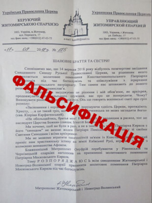 Clerics of Zhitomir eparchy received fake "orders" with a call not to commemorate the Primate of the Russian Orthodox Church.