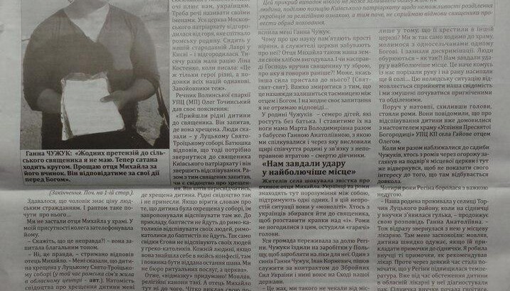 The parishioners of the Holy Protection Church in the village of Ozero of the Kivertsy district, Volyn region, adopted an appeal to the authorities and the mass media in connection with the publication in the local newspaper of lies about their rector Protopriest Mikhail Zhuromsky (full text - below), reports a UOJ correspondent.