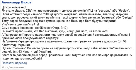 The cleric explained that there is no such form of communication as “conversation” in the law, and one is better off taking along a lawyer to a “conversation” with the SBU. About this he wrote on his FB page.