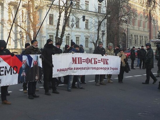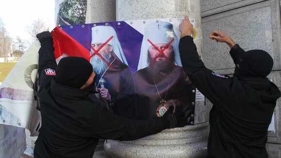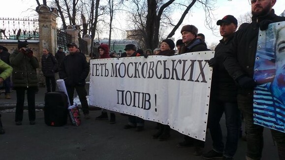 Protesters brought posters with the words "Down with Moscow priests" and "MP = FSB = Cheka descendants of the perpetrators of the Holodomor in Ukraine".