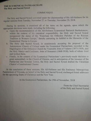The Synod of the Ecumenical Patriarchate prepared a draft statute for the future Local Church of Ukraine, says the official communique following the session of the Synod of the Constantinople Church and published on the website of the Ecumenical Patriarchate.