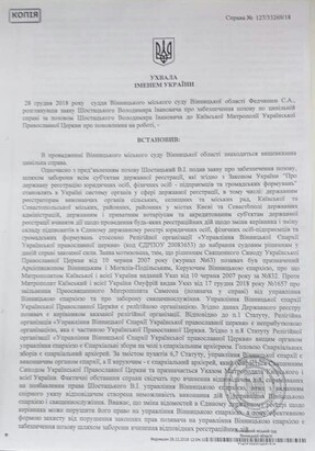 On December 28, 2018, Metropolitan Simeon (Shostatsky) appealed to the Vinnitsa City Court of Vinnitsa region with a statement of claim, in which he demands that he be reinstated as a ruling bishop of Vinnitsa eparchy. Documents of the court case were published on December 29 by Strana news outlet.