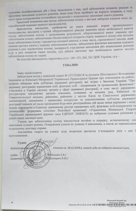 Simultaneously, Metropolitan Simeon sent a statement requesting all state registration entities to prohibit taking actions on any registration actions to change the leadership of church organizations regarding Vinnitsa eparchy of the UOC. Thus, the former ruling hierarch asks the court to prohibit the newly appointed Archbishop Varsonofy of Vinnitsa and Bar to take up his duties as a chancellor of Vinnitsa eparchy of the UOC. The court is known to have satisfied the lawsuit of the Metropolitan and forbidden changes to the Unified Register of Legal Entities regarding the management of the administration of Vinnitsa eparchy of the UOC. An appeal against this decision is filed within 15 days. According to Strana, this court decision will be immediately challenged by the UOC.