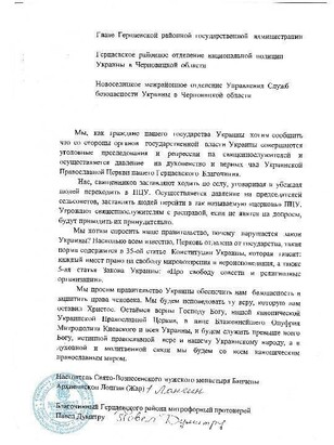 “We as citizens of our state of Ukraine want to report that from the side of state authorities criminal prosecutions and repressions of clergymen are being carried out and pressure is being exerted on the UOC clergy and faithful children of the Gertsa deanery,” the document says.