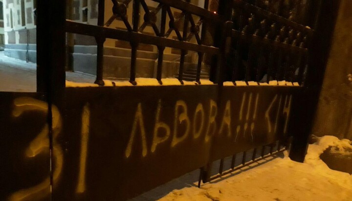 The provocative inscriptions "Moscow Patriarchate get away from Lvov", "MP-FSB", "Hello from Sich", "S-14" appeared on the fence and the gates of St. George's Cathedral of the UOC in Lvov on January 13. The investigative-operative group that arrived at the scene of the incident did not reveal any trace of the inscriptions – perhaps, the parishioners had painted them over, Vesti reports.