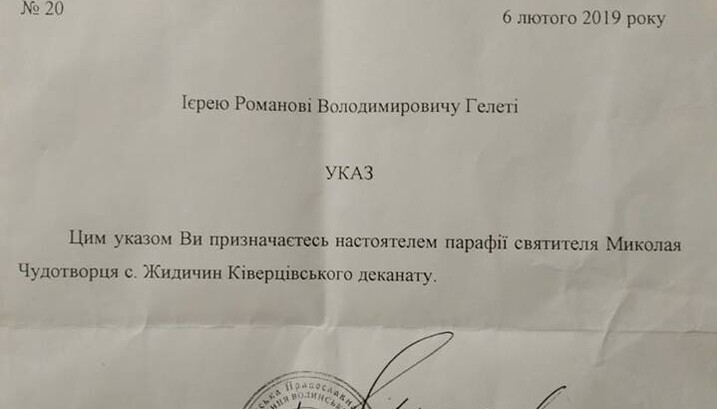 Roman Geleta, the cleric of the UOC temple of St. Nicholas the Wonderworker in vlg. Zhidychin of Kivertsy district near Lutsk, whose father, Protopriest Vladimir Geleta, is a rector of this temple, received an ordinance from the UOC KP "metropolitan" Mikhail Zinkevich that he was appointed as a new rector. The document is printed on the UOC KP form and stamped with the UOC KP. Not a single word  is said about the OCU. The UOC cleric posted the “decree” on his Facebook page.