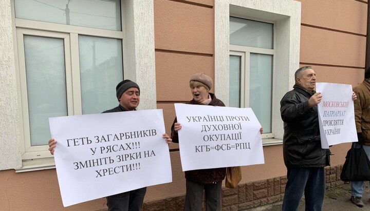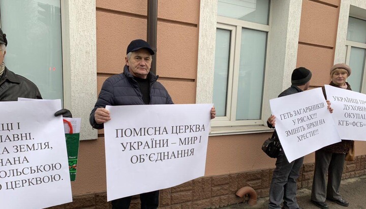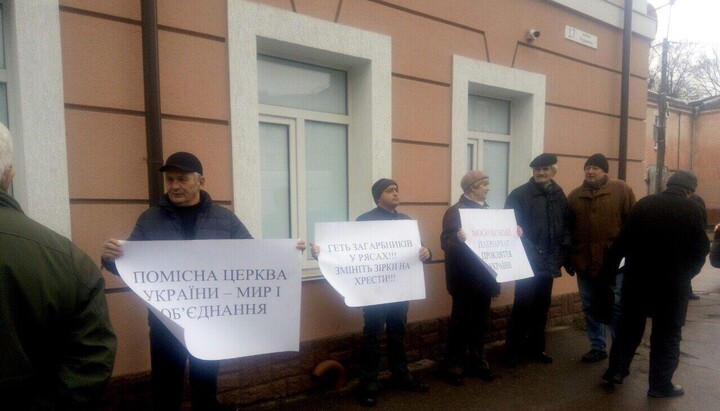 Supporters of the new church structure gathered at the walls of the eparchial administration with picket signs, which offend the believers of Ukraine.