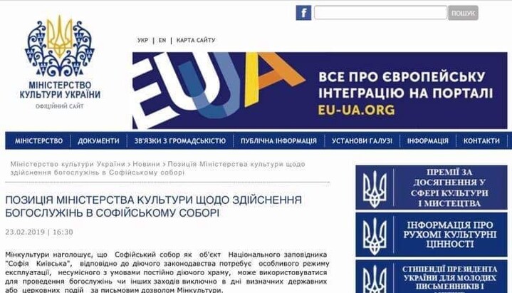 The message said that, as of Saturday, February 23, 2019, the Ministry of Culture did not grant permission to conduct a UGCC service in St. Sophia Cathedral.