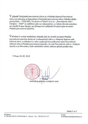 On February 20, 2019, Michael (Dandar), Archbishop of Prague and the Czech Lands, issued a decree “On the Permission to Serve the Holy Liturgy with the Clergy of Foreign Dioceses”, which clearly defined the OCU as a non-canonical structure, with which “neither the ministry nor access to the Holy Communion can occur in the land of the Prague Orthodox Diocese." The relevant documents were published by telegram channel Autokephalia.