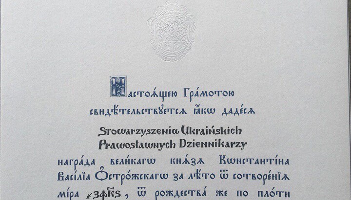 According to the Committee of Prince Konstanty Ostrogski Awards, the Union of Orthodox Journalists was awarded the prize “for their efforts in the spiritual awakening of the Ukrainian Orthodox Church and the objective presentation of the religious situation of their country”.