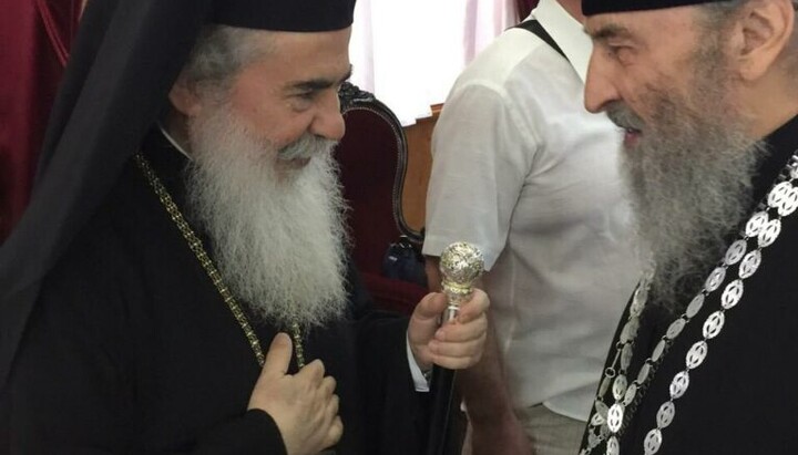 The Primates of the Jerusalem and Ukrainian Orthodox Churches met as part of the pilgrimage visit of the Ukrainian delegation to the Holy Land. During the conversation with His Beatitude Metropolitan Onuphry, Patriarch Theophilos III expressed support for the UOC and its believers.