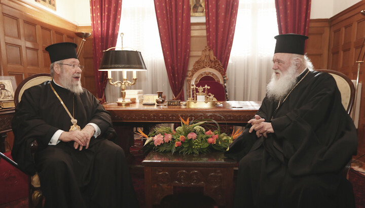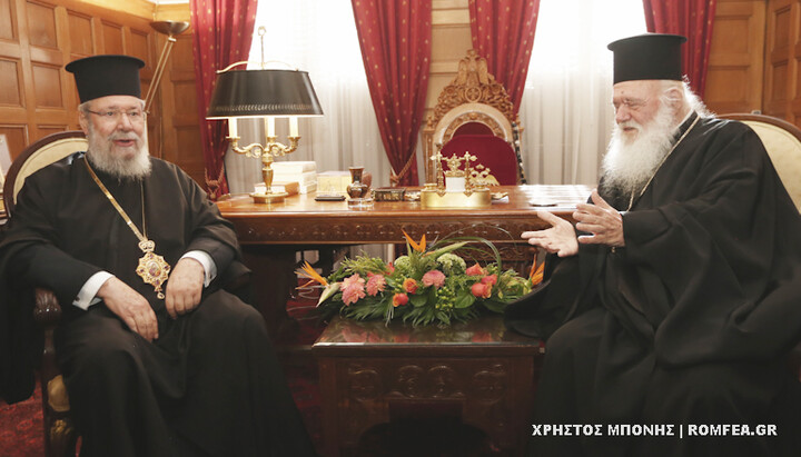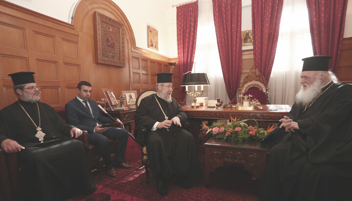 The meeting of the heads of the Orthodox Churches of Cyprus and Greece. Photo: Romfea.gr The meeting of the heads of the Orthodox Churches of Cyprus and Greece. Photo: Romfea.gr