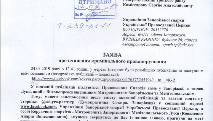 On June 3, 2019, Metropolitan Luke (Kovalenko) of Zaporozhye and Melitopol submitted to the police a statement about the illegal actions of the “Demokratychna Sokyra” (“Democratic Axe”) political party, which incite interfaith strife and hatred in society, reports the Zaporozhye Eparchy website.