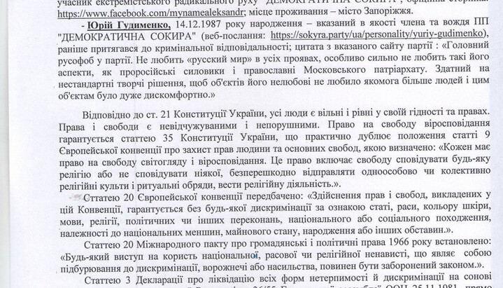 The UOC hierarch considers Alexander Lebid’ (the author of the publication) and Yuri Gudimenko (a member and leader of the party, who has previously been prosecuted for criminal offences) the organizers and executors of these deliberate illegal actions.