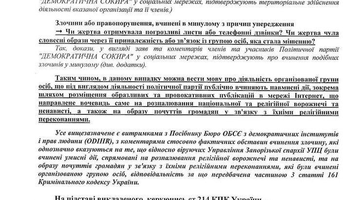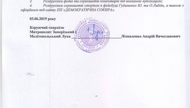 “Having concerns about the content of this publication and the general content of the page @ sokyra.party.zp (Demokratychna Sokyra. Zaporizhzhya) on the social network www.facebook.com, the Zaporozhye Eparchy Administration of the Ukrainian Orthodox Church represented by Metropolitan Luke (Kovalenko Andrei Viacheslavovich) of Zaporozhye and Melitopol, is compelled to turn to you with this statement, in order to protect the clergy, believers and society as a whole from illegal actions that are currently being carried out by a group of persons with the aim of inciting religious enmity and hatred," Metropolitan Luke said in a statement.
