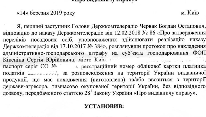 Kikenin was charged with violation of Article 28 (1) of the Law of Ukraine on Publishing, according to which publishing products can be imported “from the territory of the aggressor state” and distributed to the territory of Ukraine only with the permission of the central authority responsible for information policy.