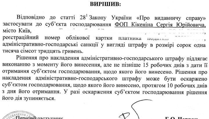 There, the first deputy head of the Committee Bogdan Chervak (who is also the current head of the OUN and the Ukrainian Nationalist Party), signed a fine of 10 non-taxable minimums – UAH 41,700.
