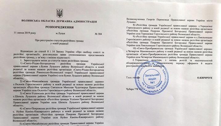 He also published a photocopy of the relevant order, which was signed by the acting head of the Volyn RSA Alexander Kirichuk. In the text of the order, Kirichuk named 19 religious communities of the UOC the changes in the Statutes of which he ordered to register.