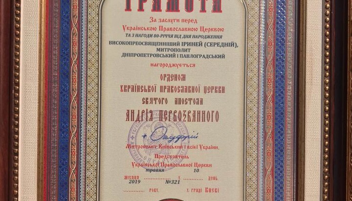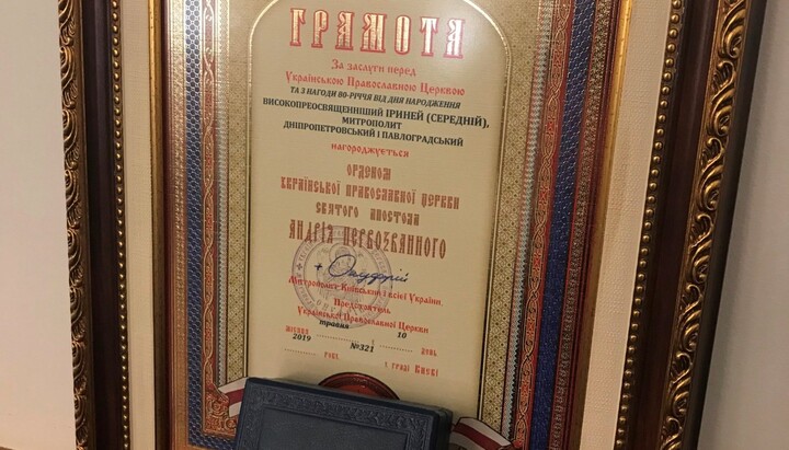 On July 28, 2019, the Primate of the Ukrainian Orthodox Church, His Beatitude Metropolitan Onuphry of Kiev and All Ukraine, presented Metropolitan Irenaeus with a high church award – the Order of St. Apostle Andrew the First-Called, reports the press service of the Dnepropetrovsk Eparchy.