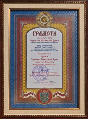 Also on this day, for the merits to the Ukrainian Orthodox Church and on the occasion of the 40th anniversary, the vicar of the Dnepropetrovsk Eparchy, Bishop Andrei of Petropavlovka, was awarded the Order of St. Demetrius, Metropolitan of Rostov.