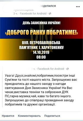 "This ‘event on the occasion of the Day of Defender of Ukraine’, which was announced on social networks, according to the organizers, was supposed to be ‘an exhibition of equipment and weapons of the Voluntary Ukrainian Corps, accompanied with beautiful music, tea, coffee and much more." In fact, the whole “event” was about placing provocative posters and loudspeakers through which offensive songs were turned on to the full for those who had gathered for prayer,” the press service of the Sumy Eparchy of the UOC reported.
