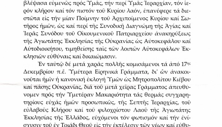 “We sent Your Beatitude personally our sincere congratulations of the Holy Hierarchy and pious clergy, the God-loving people of the Holy Hellenic Church and wishes of the enlightenment and support by the Divine Trinity in the fulfillment of your new duties and responsibilities as the Primate of the Ukrainian Church,” wrote Archbishop Ieronymos II of Athens and All Greece.