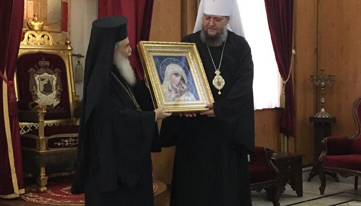 In turn, Metropolitan Alexy gifted a copy of the miraculous Kasperovskaya Icon of the Mother of God to the Primate of the Jerusalem Orthodox Church.