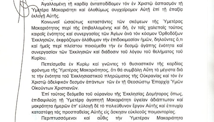 In his address, Patriarch Theodore calls Sergey Dumenko “a very dear and welcome brother and concelebrant of our Modesty,” whom the head of the Church of Alexandria “strongly kisses and festively congratulates him.”