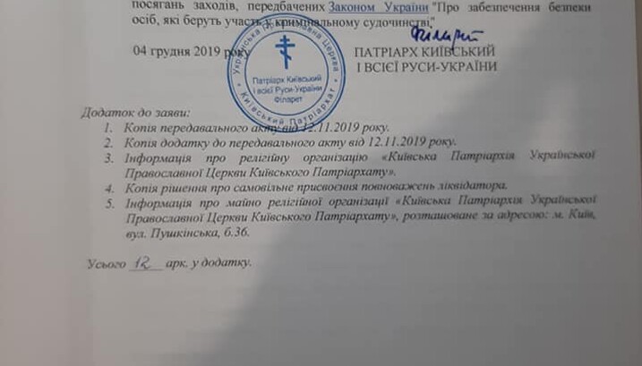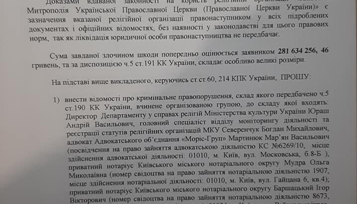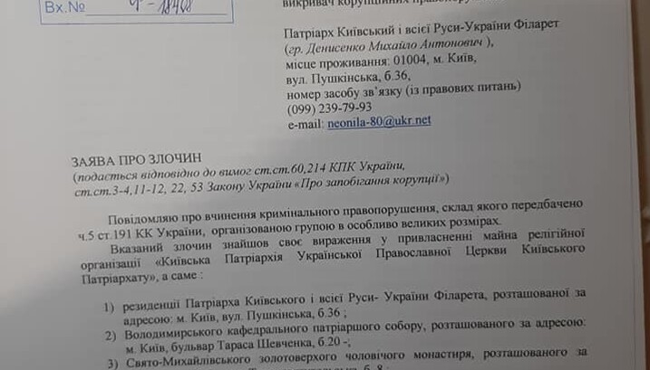 “I report on the commission of a criminal offence, the body of which is provided for in Part 5 of Art. 191 of the Criminal Code of Ukraine, organized by a group on a particularly large scale. The specified crime consists in the appropriation of property of the religious organization ‘Kiev Patriarchy of the Ukrainian Orthodox Church of the Kiev Patriarchate’,” the statement said.
