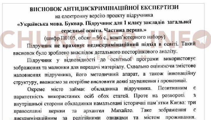 “In it, the expert claims that ‘a two-parent family of three generations is a stereotype and discrimination, because not all children have a complete family and not all have older relatives,” the report says, “illustrating the letter “i“ with an Orthodox icon is "discrimination based on religious beliefs" and the centre spread placement of pictures of historical sights of Kyiv – Orthodox churches and the Archangel Michael is "discriminatory on religious grounds and place of residence, it is recommended to replace with other symbols, monuments and the like."