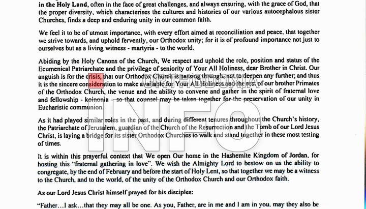 “It is the sincere consideration to make it available for Your All Holiness and the rest of your brother Primates of the Orthodox Church the venue and the ability to convene and gather in the spirit of fraternal love and fellowship – koinonia – so that counsel may be taken together for the preservation of our unity in Eucharistic communion <...>,” said the Primate of the Jerusalem Patriarchate to the head of Phanar. “It is within this prayerful context that We open Our home in the Hashemite Kingdom of Jordan, for hosting this ‘fraternal gathering in love’. We wish the Almighty Lord to bestow on us the ability to congregate, by the end of February and before the start of Holy Lent, so that together we may be a witness to the Church, and to the world, of the unity of the Orthodox Church and our Orthodox faith.”