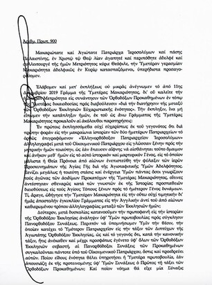 “To begin with, we are surprised, not pleasantly, by the fact that for the first time in the centuries-long history of the two Patriarchates, the ‘Greek Orthodox Patriarchate of Jerusalem’ corresponds with the Ecumenical Patriarch in a foreign language and not our mother tongue, as if he has suddenly stopped feeling consanguineous and that he belongs in the same historic and suffering Nation,” addressed Patriarch Bartholomew the Primate of the Church of Jerusalem. “What has led your Beatitude to sent us this other than honourable circular letter in English instead of following the centuries-old standard correspondence between our Churches?”