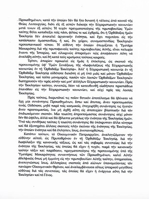 “It is needless to remind you of the position your Patriarchate holds in the rank of the Dyptichs of the Most Holy Orthodox Church, as well as the fact that, in the canonical order, which has always and until recently been respected by all Orthodox Churches, the Pan-Orthodox Synods of the Primates have been always summoned by the Ecumenical Patriarch, who presides over these Synods. What kind of unity does your initiative want to serve, if the First of the Orthodox Primates in rank is absent from the Synod you propose?”
