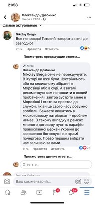 Before arriving in the village, in one of his publications on Facebook, Drabinko addressed in a rather harsh manner the rector of the UOC temple in Morozovka Nikolai Brega, who informed him that he would meet with him “in court”, and also “recommended” the clergyman to meet him in the village and to stand with him on the same throne, as Father Nikolai "would sensibly do in his time".