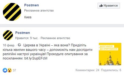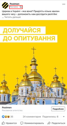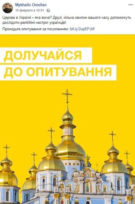 On February 10, 2020, the press officer of the OCU Mikhail Omelian and the advertising agency “Postmen” began promoting the social survey “Church in Ukraine - what is it like?” in social networks.