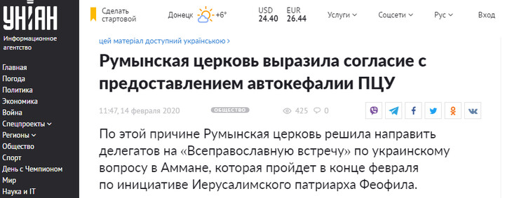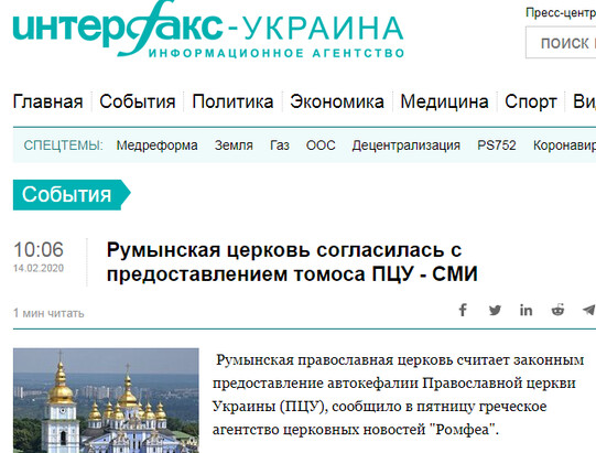 On February 14, 2020, in the Network actively molested the fake that the Romanian Orthodox Church allegedly recognized the OCU is actively picked up by a number of websites, including “Interfax-Ukraine” and “UNIAN” news agencies, the “Golos UA” media group and a number of other Ukrainian resources.