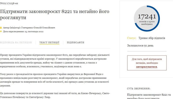In this petition, Honcharenko requests Zelensky to support bill No. 8221 to ban the Russian Orthodox Church on the territory of Ukraine.