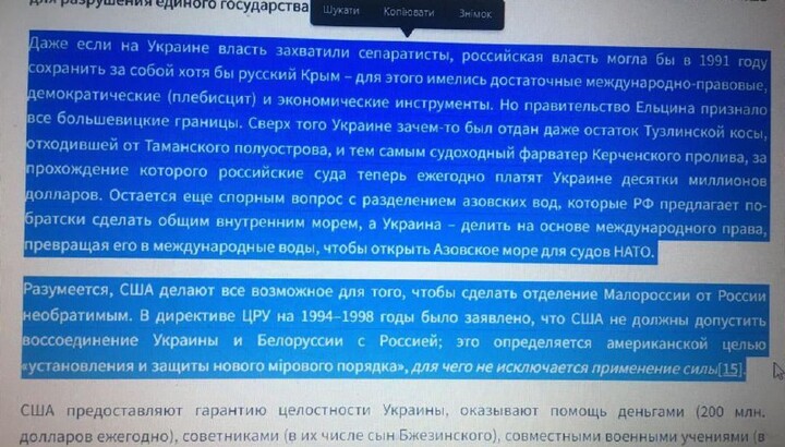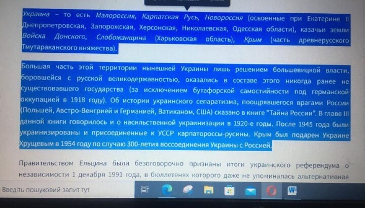 The report said that the found literature denied "the existence of the Ukrainian people, its language and the very right of Ukraine to statehood, and, on the contrary, noted that it is an allegedly artificially created state".