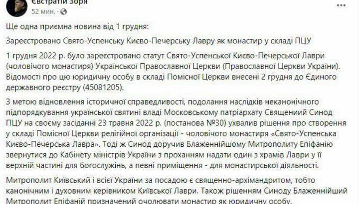 OCU “archbishop” Ivan (Eustratiy) Zoria stated that on December 1, 2022, the charter of the Holy Dormition Kyiv-Pechersk Lavra (monastery) of the Orthodox Church of Ukraine was registered.