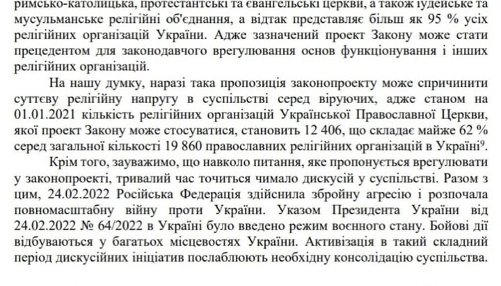 “In our opinion, now such a proposal of the bill may cause a significant religious tension in society among believers, because as of 01.01.2021, the number of religious organizations of the UOC, which the draft law can refer to, is 12 406, which is almost 62% of the total number of 19 860 Orthodox religious organizations in Ukraine. Deliberations in society have been going on for a long time around the issue proposed in the draft law. On February 24, 2022, Russia started a full-scale war against Ukraine. Activation of discussion initiatives in such a difficult period weakens the required consolidation of society," the department concluded.