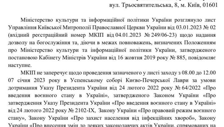 On January 5, 2023, the Ministry of Culture and Information Policy authorized "Metropolitan" Epifaniy to hold a "Christmas service" at the Dormition Cathedral of the Kyiv Cave Lavra, and the Reserve "Kyiv-Pechersk Lavra" signed an agreement with the OCU to conduct a "service" on January 7 from 8:00 am to 12 noon, reports the BBC.